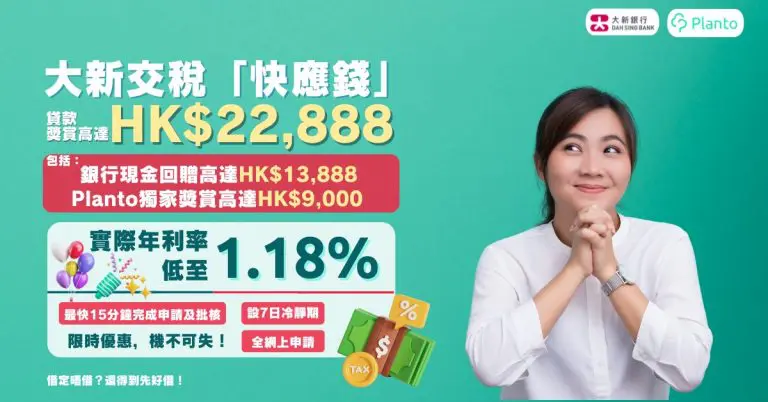 交稅deadline又到、年尾年頭使費又特別多,唔少打工仔正面臨大額支出壓力。稅貸可以用較低利率及分期方式提供靈活現金流,而今年眾多稅貸產品中,大新交稅「快應錢」的優惠特別進取,合資格客戶於相關推廣期內成功申請可享實際年利率低至1.18%^,而經Planto成功申請及提取貸款更可獲取大新銀行送出的高達HK$13,888* 現金回贈,以及Planto獨家送出的高達HK$9,000現金券, 獎賞總值高達HK$22,888。